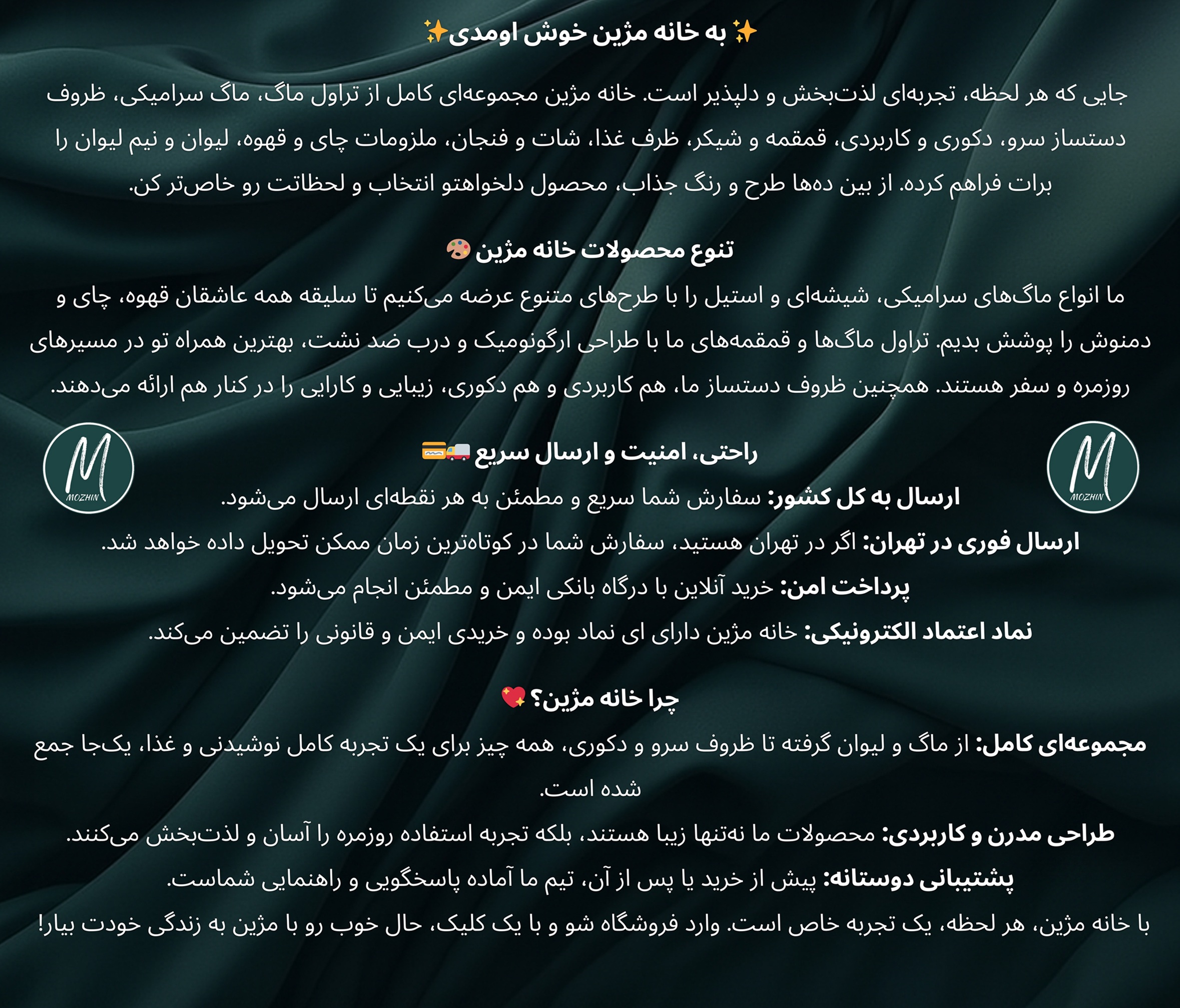 تمامی محصولات خانه مژین (به جز ماگهای دستساز که تولید خودمون هستند) از برندهای معتبر وارداتی تهیه میشوند.